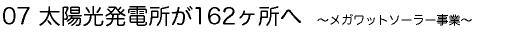 06年8月~09年3月 環境省の3ヵ年「メガワットソーラー事業」などにより太陽光発電所を07年度44ヶ所、08年度48ヶ所、09年度32ヶ所設置、全合計162ヶ所となる。